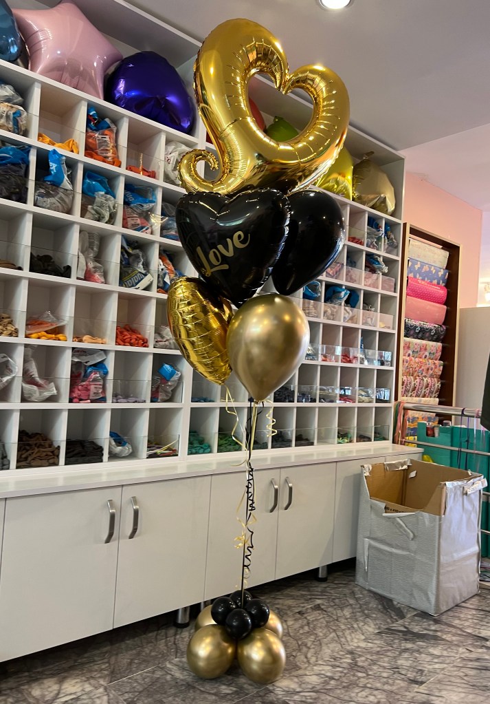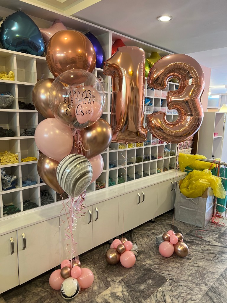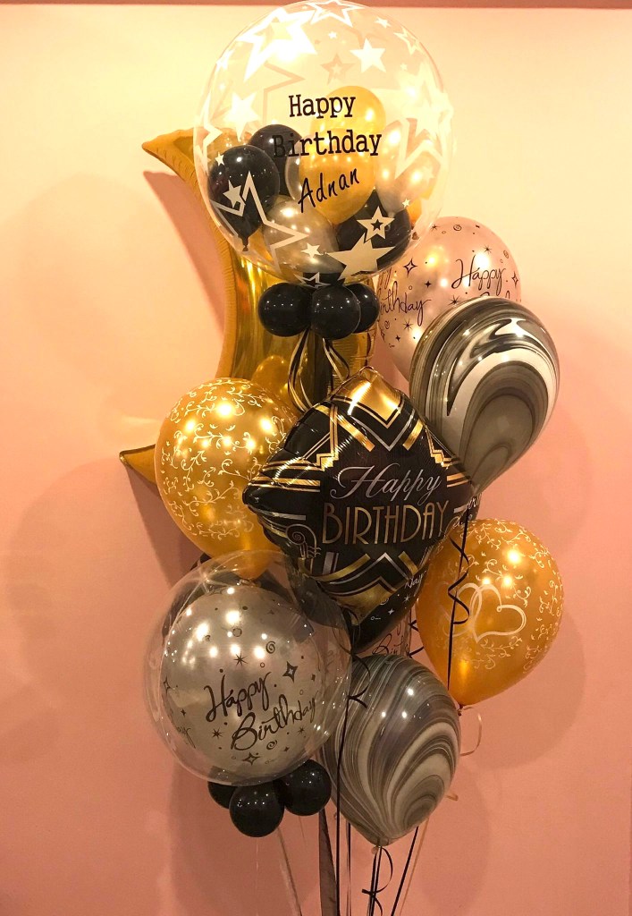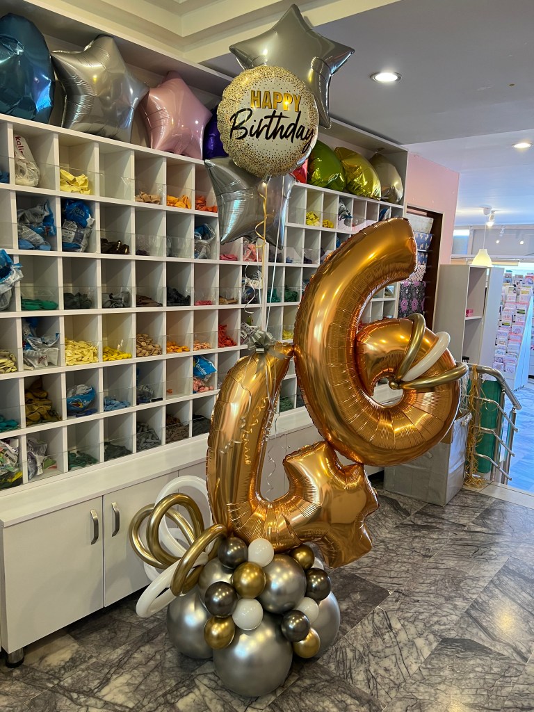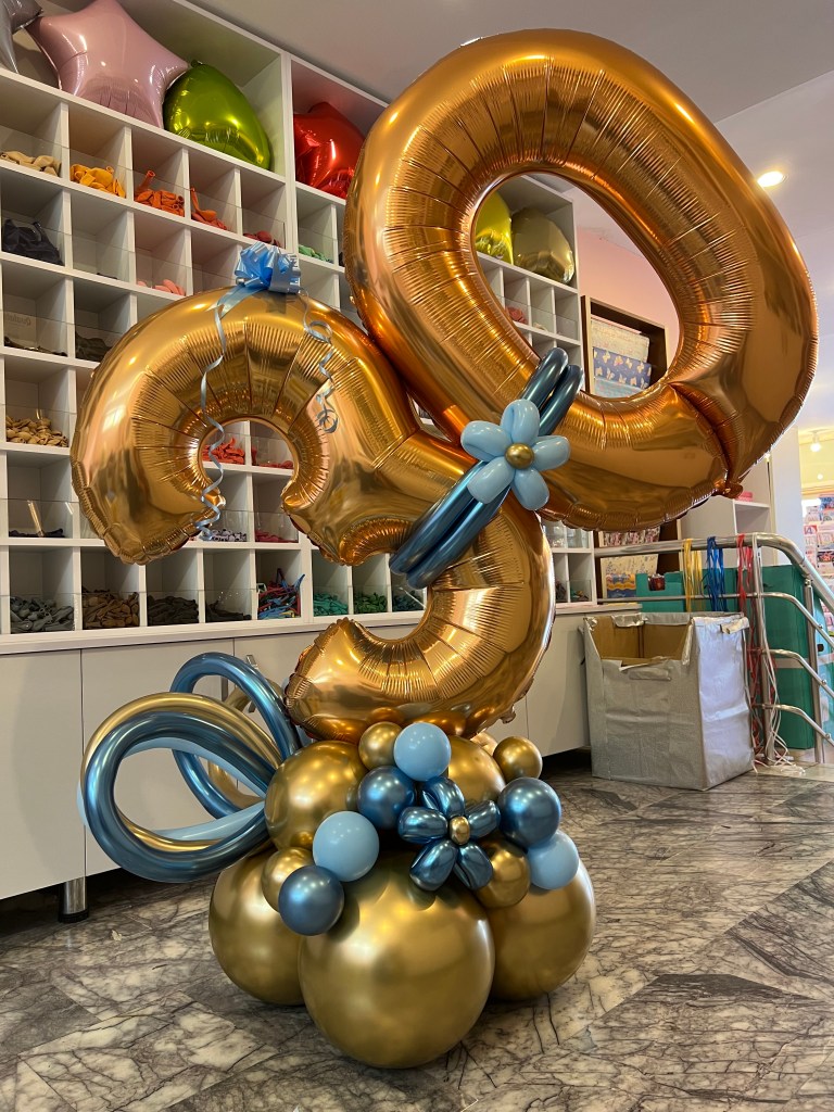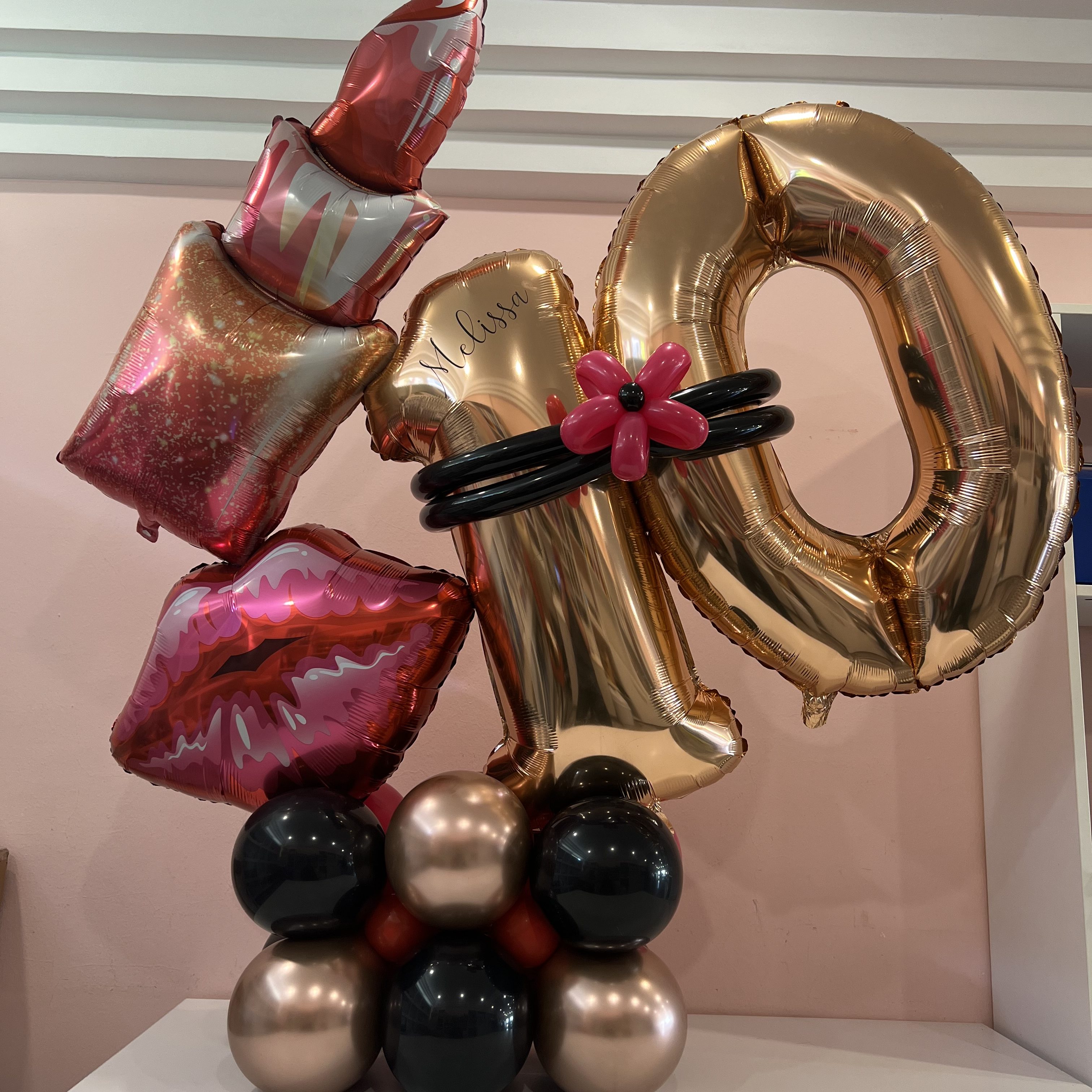 Celebrate their birthday in style! Surprise your recipient with this delightful birthday balloon stand to celebrate their special day. Available in several colors and numbers and features large number balloons on a bed of smaller balloons.